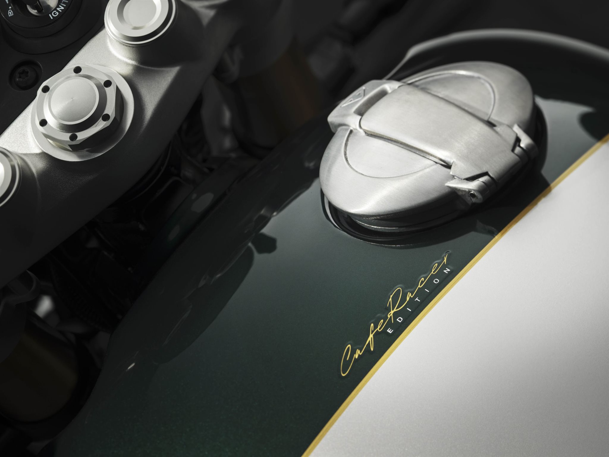 Zusatzausstattung der Cafe Racer Edition: Sonderlackierung an Tank, Scheinwerfer, Seitendeckel & Felgen, niedrigerer Stummellenker, CNC gefräste Lenkerendenspiegel, Kniepads, braune Monopostositzbank mit Diamond Stitch & lackierter Sitzbankabdeckung